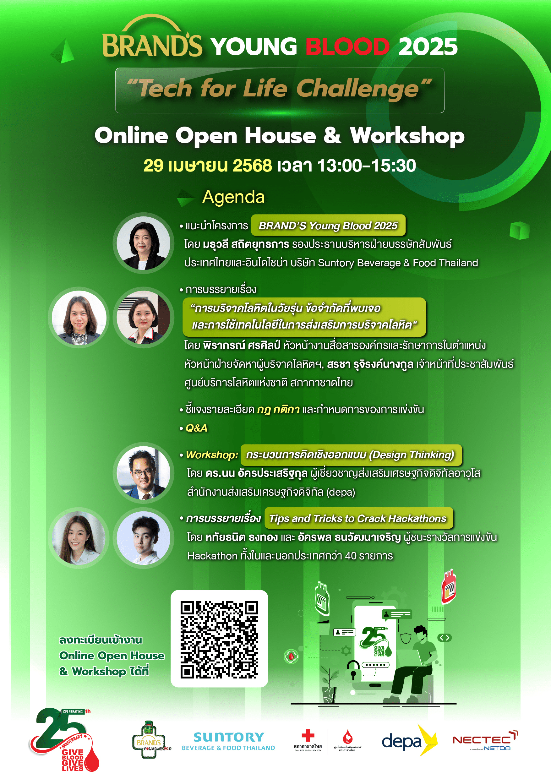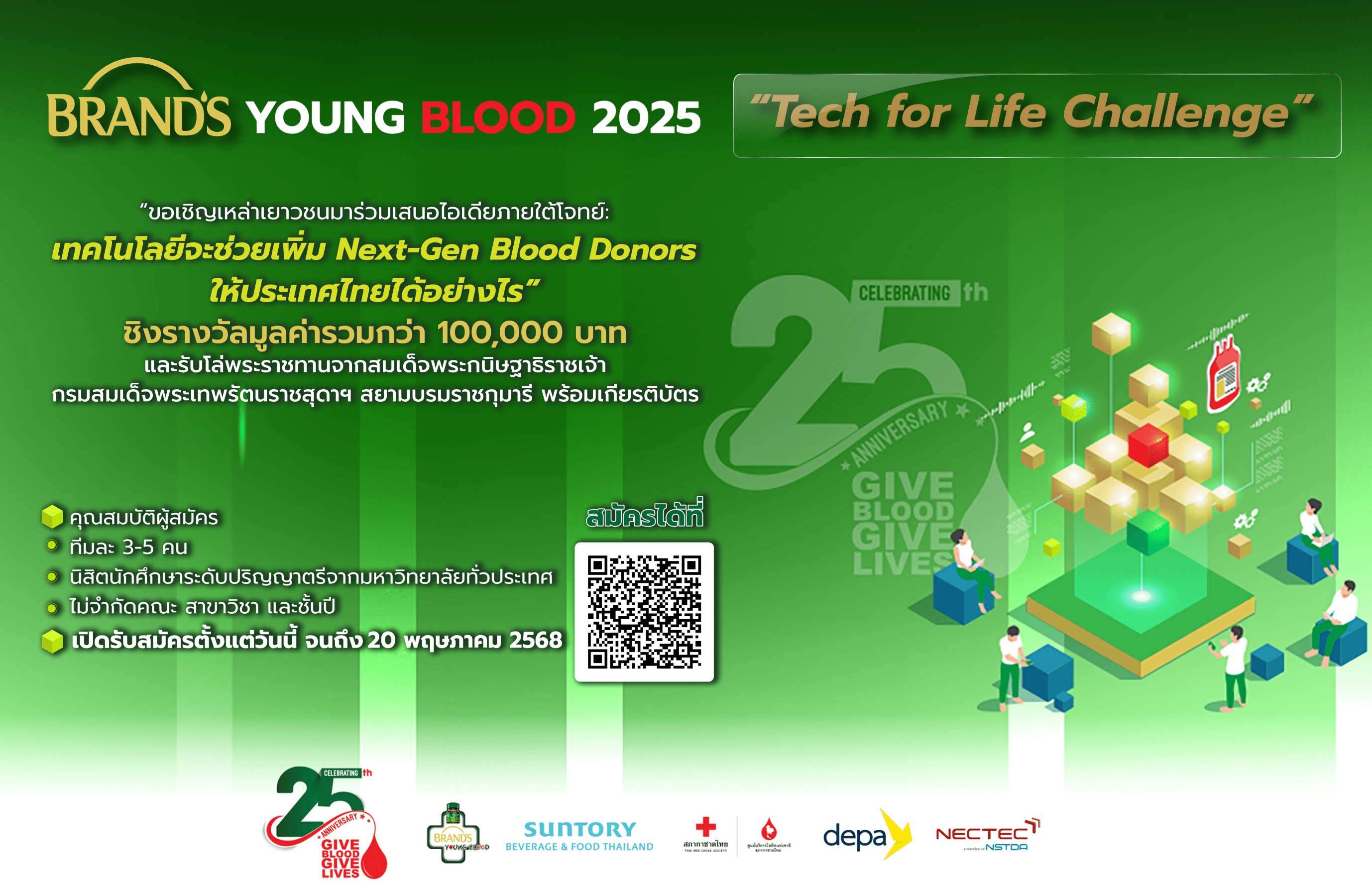 บริษัท ซันโทรี่ เบเวอเรจ แอนด์ ฟู้ด (ประเทศไทย) จำกัด ผู้นำตลาดอาหารเสริมสุขภาพภายใต้ตราผลิตภัณฑ์ “แบรนด์” ในประเทศไทยและภูมิภาคเอเชีย ร่วมกับศูนย์บริการโลหิตแห่งชาติ สภากาชาดไทย จัดกิจกรรม “แบรนด์…  พลังเลือดใหม่ ต่อพลังชีวิต 2568: Tech for Life Challenge” เนื่องในโอกาสครบรอบ 25 ปีของโครงการ “BRAND’S Young Blood” โดยเชิญชวนนิสิตนักศึกษาทั่วประเทศส่งไอเดียสร้างสรรค์สื่อดิจิทัลเพื่อกระตุ้นการบริจาคโลหิต ชิงทุนการศึกษามูลค่ารวม 100,000 บาท พร้อมโล่พระราชทานจากสมเด็จพระกนิษฐาธิราชเจ้า กรมสมเด็จพระเทพรัตนราชสุดา ฯ สยามบรมราชกุมารี และผลิตภัณฑ์แบรนด์ซุปไก่สกัดดื่มฟรีตลอด 1 ปี โดยเปิดรับสมัคร ระหว่างวันที่ 9 เมษายน – 20 พฤษภาคม 2568 พร้อมจัดกิจกรรมรณรงค์บริจาคโลหิตต่อเนื่องตลอดปี