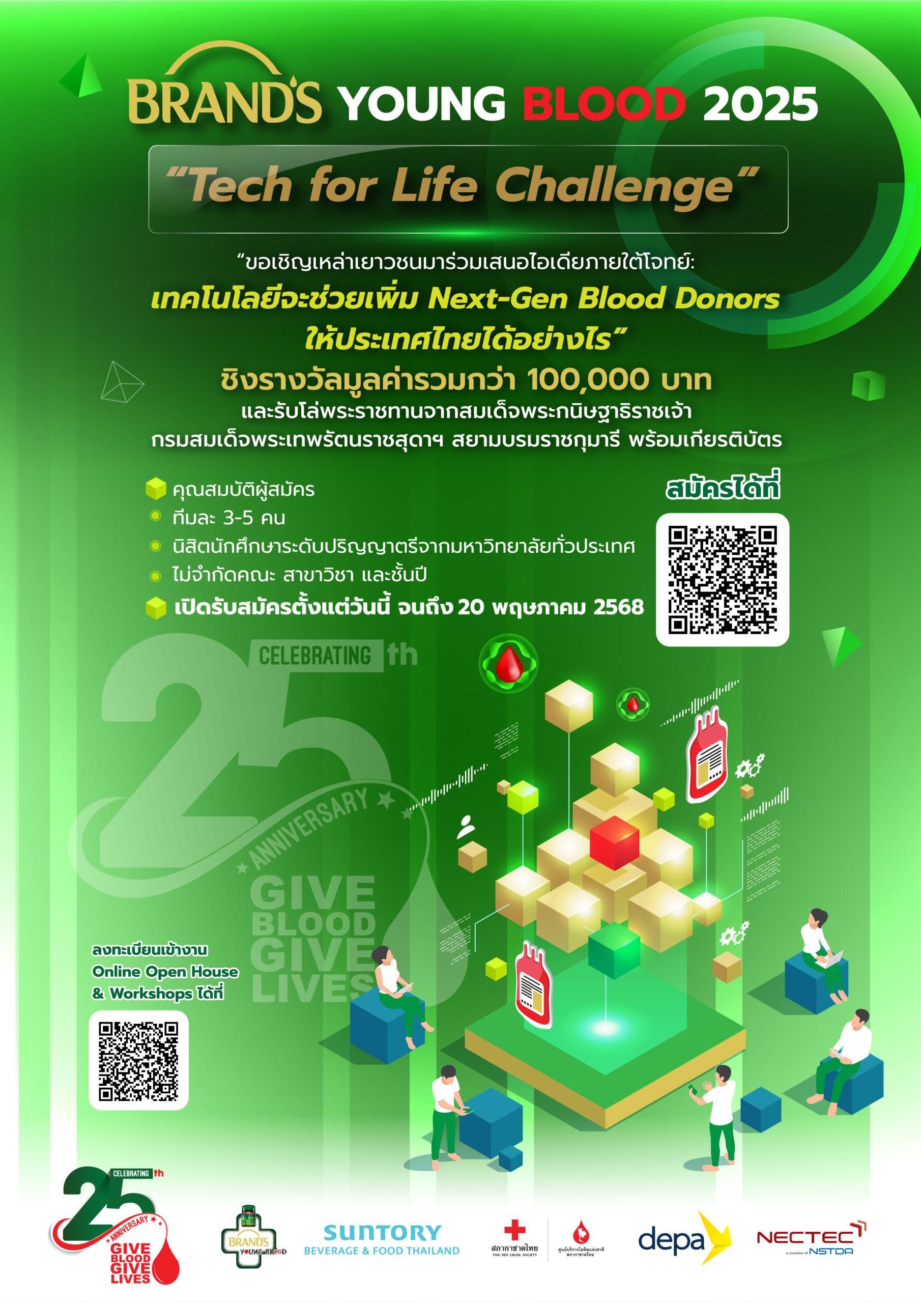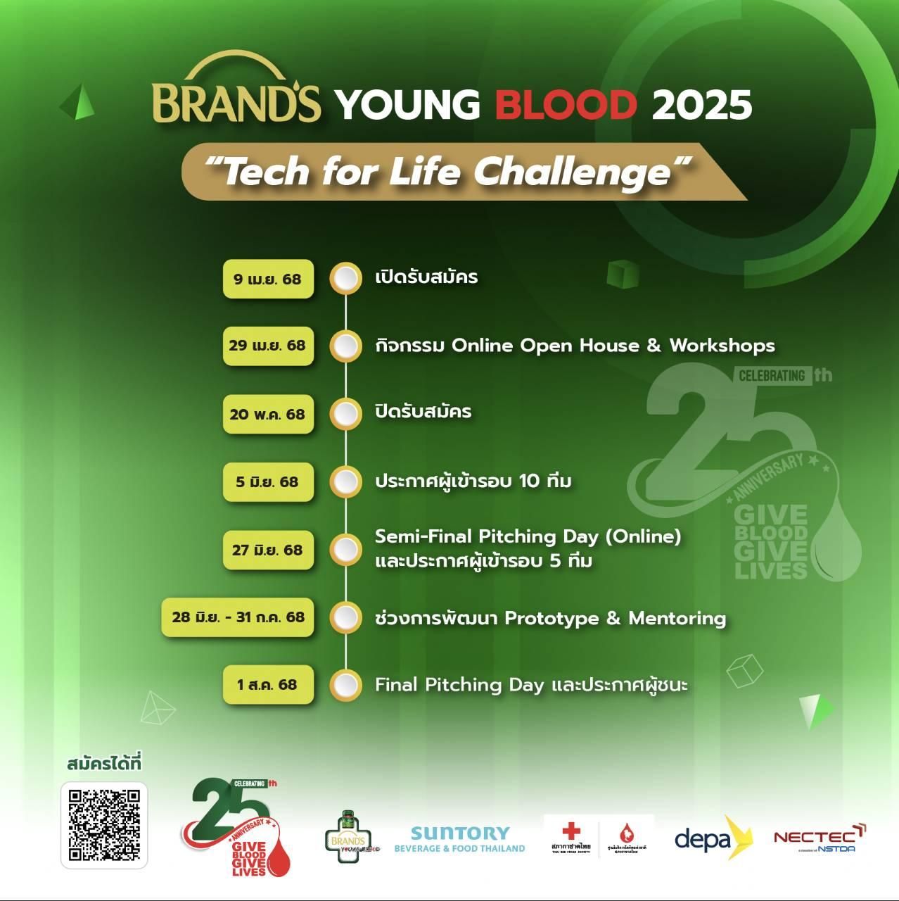 ทั้งนี้ นอกจากการจัดแข่งขัน ‘แบรนด์…พลังเลือดใหม่ ต่อพลังชีวิต : Tech for Life Challenge’ แล้ว ยังมีกิจกรรมรณรงค์ อีกหลากหลายรูปแบบที่เราเตรียมจัดขึ้นตลอดทั้งปี ไม่ว่าจะเป็น งาน WORLD BLOOD DAY กิจกรรมอบรมให้ความรู้และเชิญชวนบริจาคโลหิตในวันผู้บริจาคโลหิตโลก กิจกรรม Roadshow ออกหน่วยรับบริจาคโลหิต กิจกรรมรณรงค์บริจาคโลหิตในสถาบันการศึกษา ภายใต้โครงการ “BRAND’S Young Blood 2025” เพื่อให้ความรู้ด้านการเตรียมพร้อมก่อนการบริจาคโลหิตและสร้างจิตสำนึกของการเป็นผู้ให้ และส่งเสริมการบริจาคโลหิตในวงกว้างอย่างต่อเนื่อง เพื่อให้บรรลุเป้ายอดการบริจาคโลหิตภายใต้โครงการฯ ปี 2568 จำนวน 125,000 ยูนิต โดยมีกลุ่มเป้าหมายเป็นนิสิต นักศึกษาระดับอุดมศึกษา เนื่องจากเป็นกลุ่มที่มีช่วงระยะเวลาการบริจาคโลหิตได้ยาวนาน นำไปสู่การร่วมเป็นพลังเลือดใหม่ ที่สามารถร่วมบริจาคโลหิตกับโครงการฯ ได้อย่างยั่งยืนต่อไปในอนาคต”