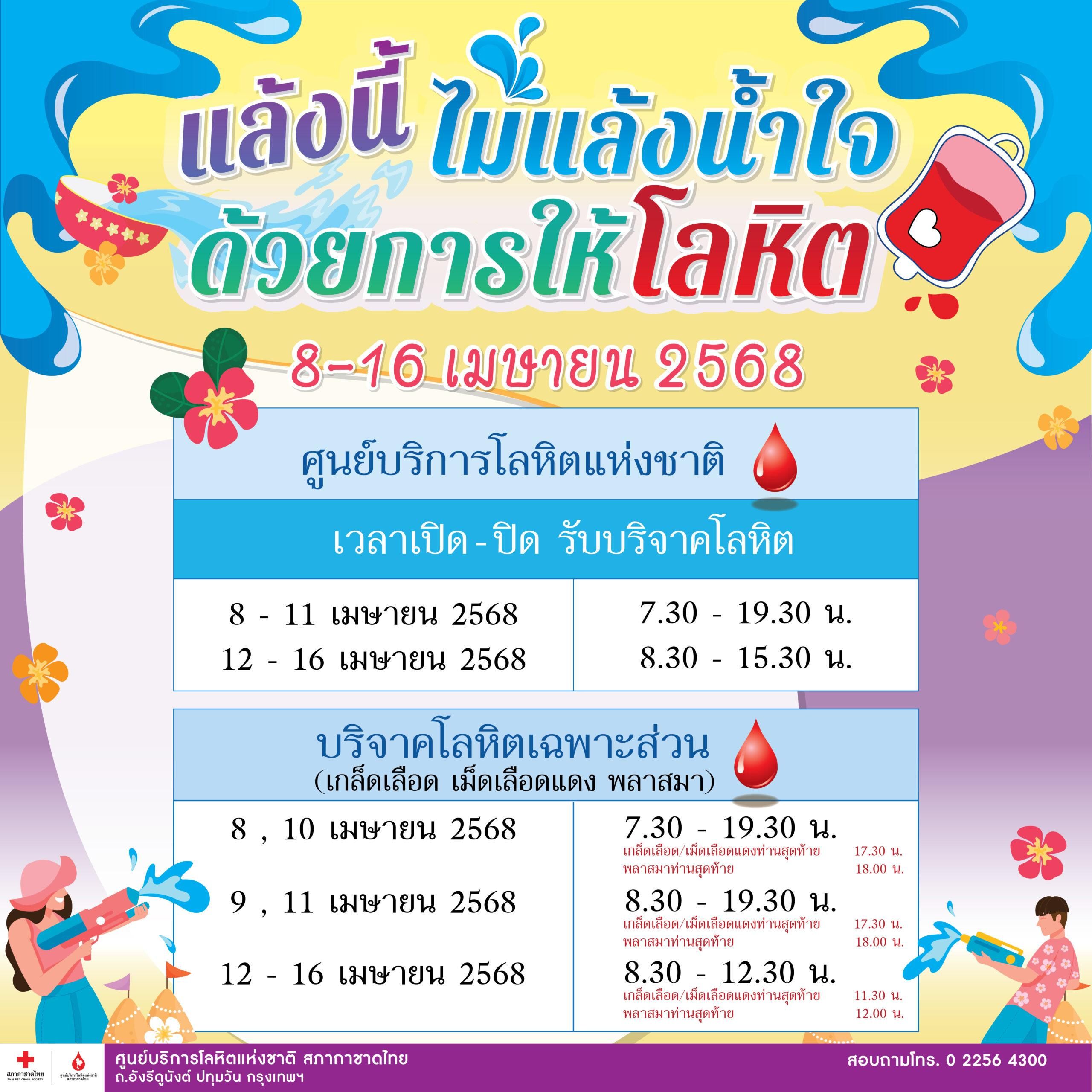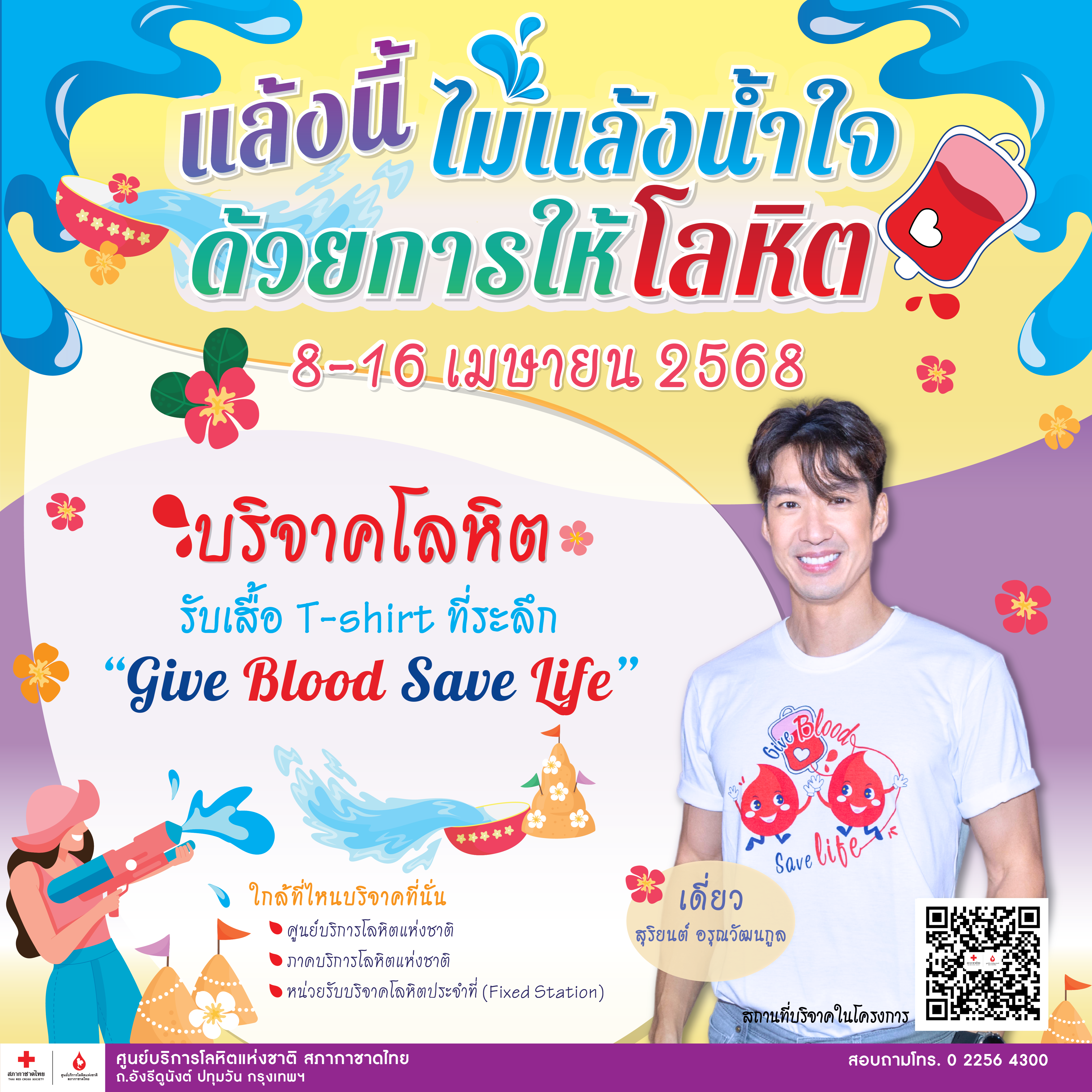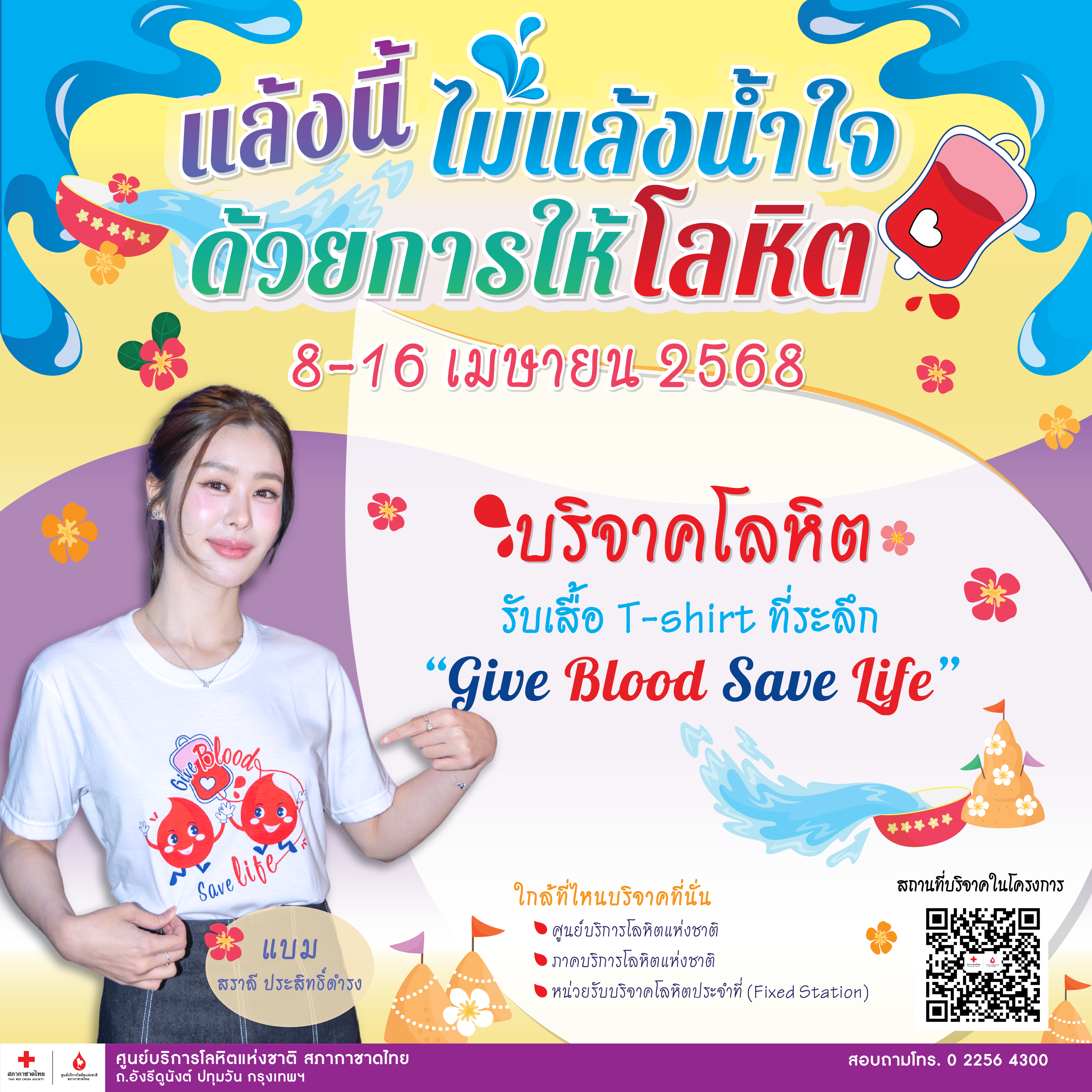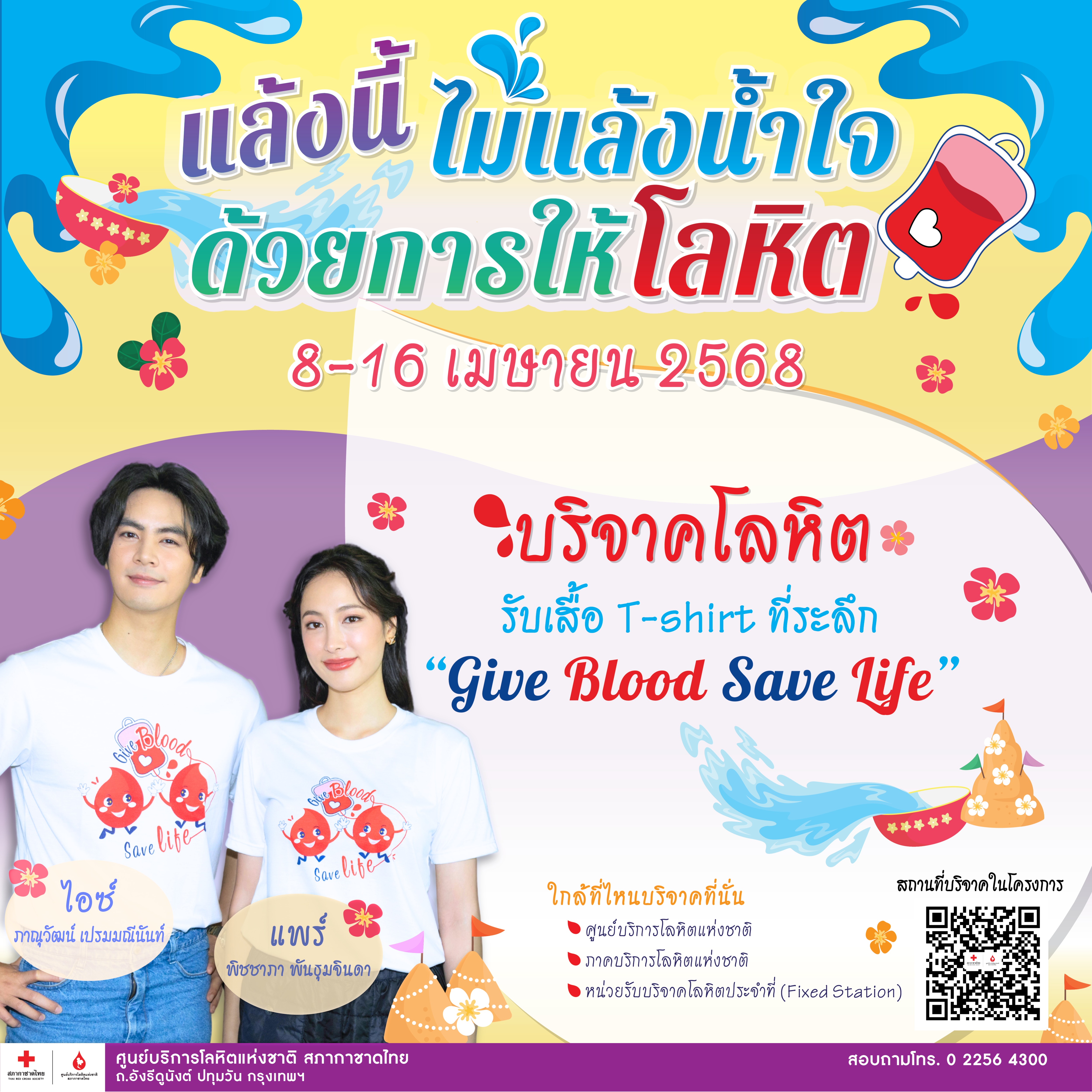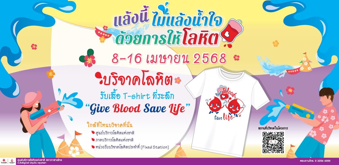 ศูนย์บริการโลหิตแห่งชาติ สภากาชาดไทย ชวนคนไทย ร่วมทำบุญบริจาคโลหิตต้อนรับปีใหม่ไทย ในโครงการ “แล้งนี้ ไม่แล้งน้ำใจ ด้วยการให้โลหิต” ระหว่างวันที่ 8 – 16 เมษายน 2568 เตรียมความพร้อมสำรองโลหิตรับมือหยุดยาวช่วงเทศกาลสงกรานต์ บริจาคโลหิต ณ ศูนย์บริการโลหิตแห่งชาติ หน่วยรับบริจาคโลหิตประจำที่ (Fixed Station) ภาคบริการโลหิตแห่งชาติ 12 แห่งทั่วประเทศ โรงพยาบาลสาขาบริการโลหิต 8 แห่งในกรุงเทพมหานคร รับเสื้อยืด “Give Blood Save Life” เป็นที่ระลึกแทนคำขอบคุณ