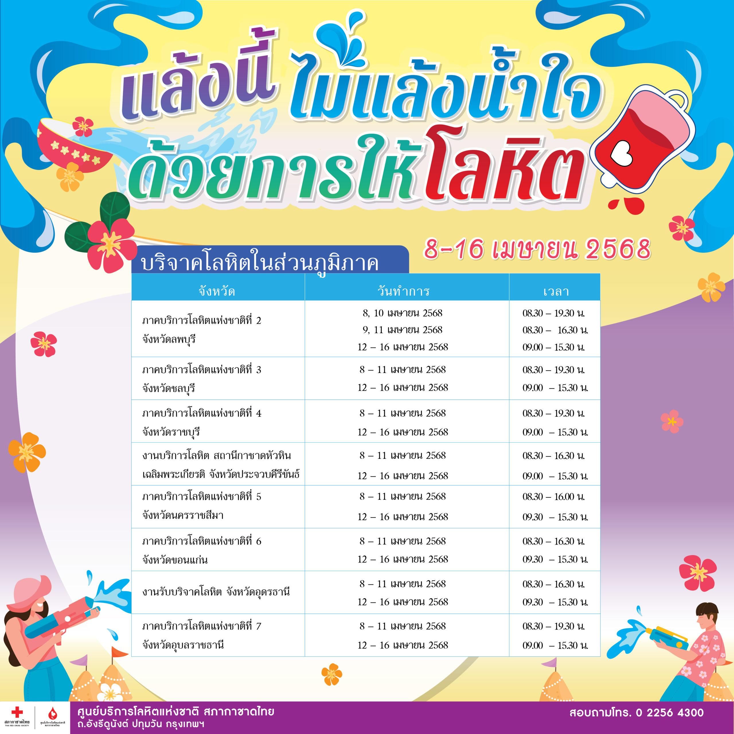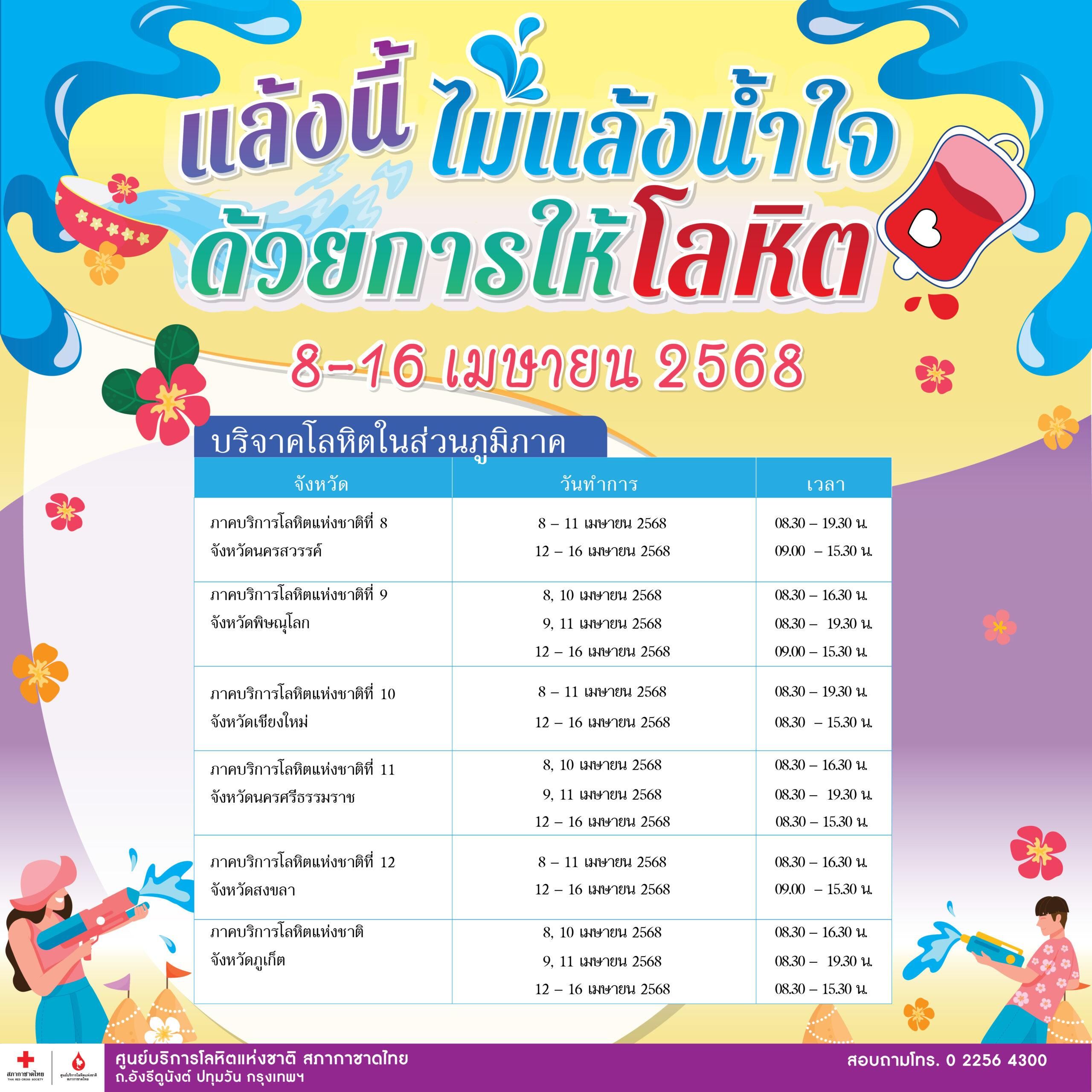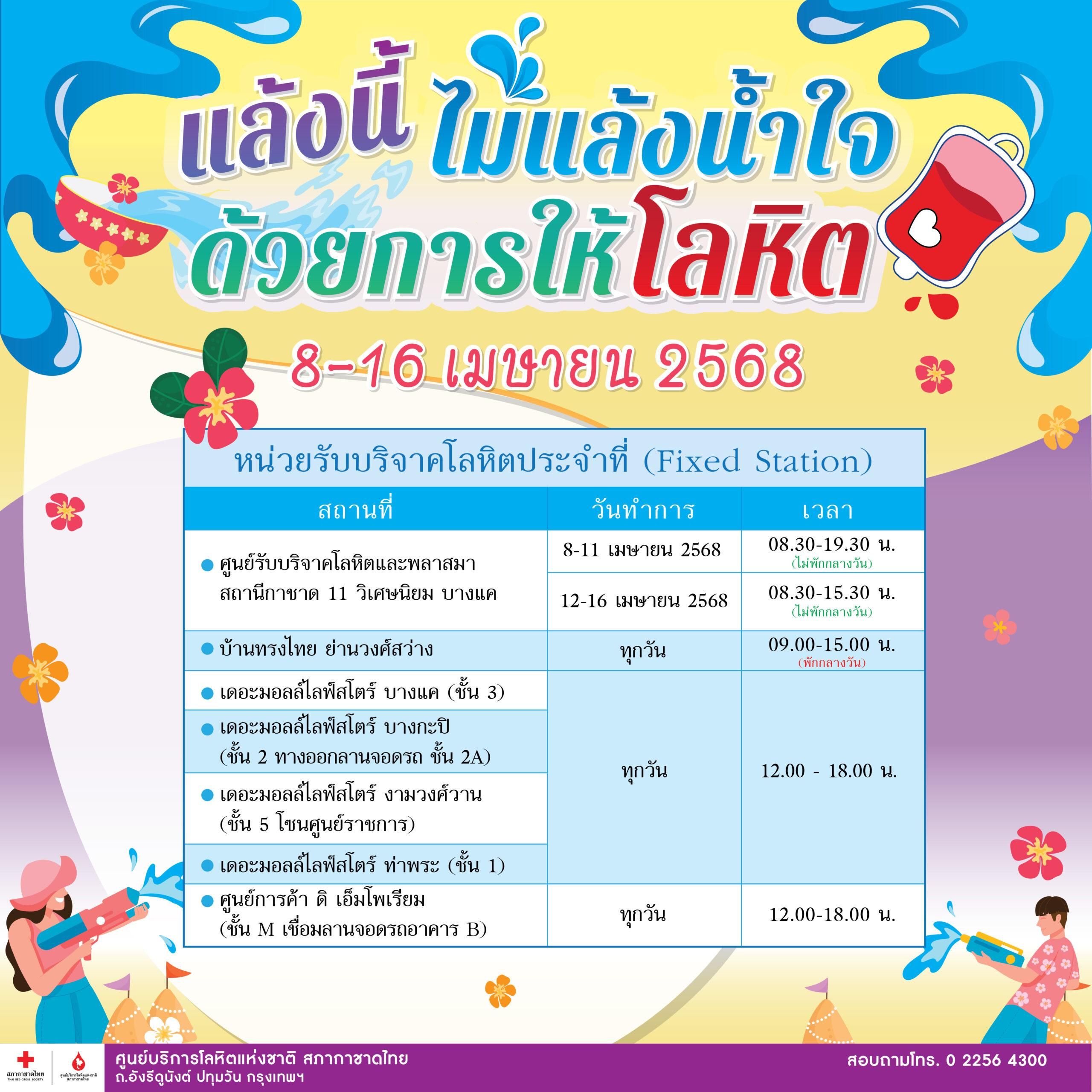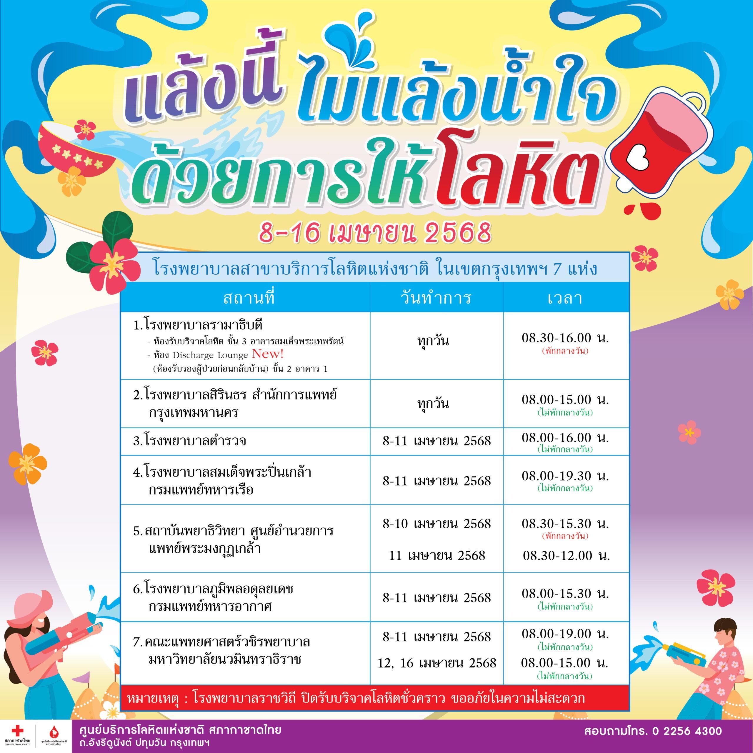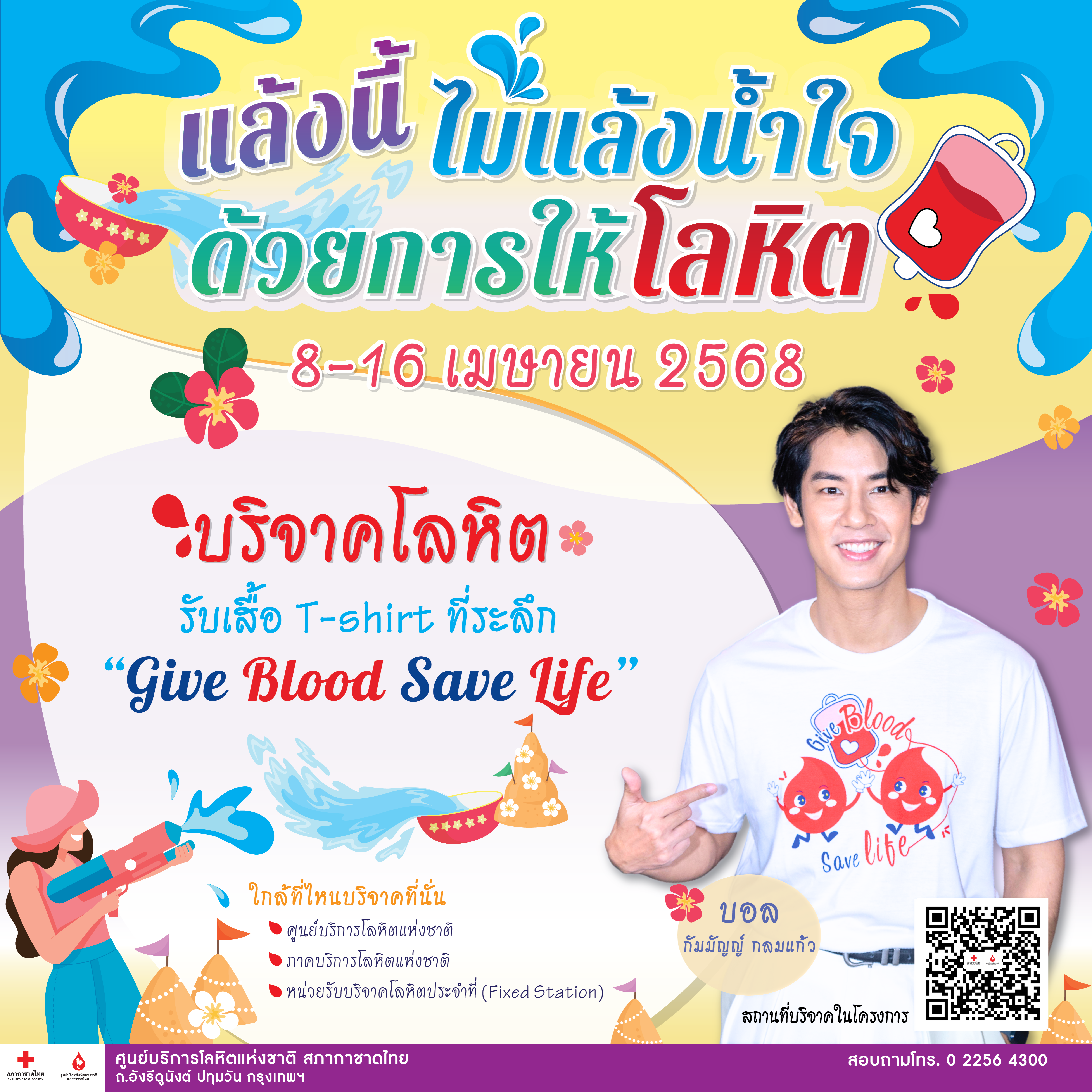 ศูนย์บริการโลหิตแห่งชาติ สภากาชาดไทย ชวนคนไทย ร่วมทำบุญบริจาคโลหิตต้อนรับปีใหม่ไทย ในโครงการ “แล้งนี้ ไม่แล้งน้ำใจ ด้วยการให้โลหิต” ระหว่างวันที่ 8 – 16 เมษายน 2568 เตรียมความพร้อมสำรองโลหิตรับมือหยุดยาวช่วงเทศกาลสงกรานต์ บริจาคโลหิต ณ ศูนย์บริการโลหิตแห่งชาติ หน่วยรับบริจาคโลหิตประจำที่ (Fixed Station) ภาคบริการโลหิตแห่งชาติ 12 แห่งทั่วประเทศ โรงพยาบาลสาขาบริการโลหิต 8 แห่งในกรุงเทพมหานคร รับเสื้อยืด “Give Blood Save Life” เป็นที่ระลึกแทนคำขอบคุณ