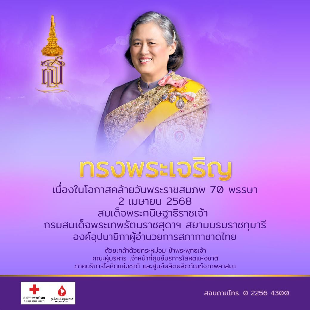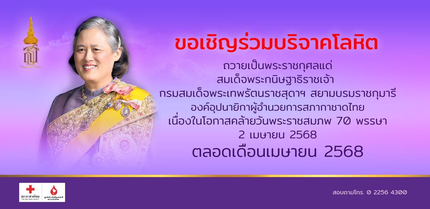 ศูนย์บริการโลหิตแห่งชาติ สภากาชาดไทย เชิญชวนชาวไทยร่วมแสดงความจงรักภักดี และสำนึกในพระมหากรุณาธิคุณ ทำความดีบริจาคโลหิตในโครงการ “บริจาคโลหิตเฉลิมพระเกียรติ 70 พรรษา กรมสมเด็จพระเทพฯ” องค์อุปนายิกาผู้อำนวยการ สภากาชาดไทย ในโอกาสทรงเจริญพระชนมายุ 70 พรรษา 2 เมษายน 2568 ผู้บริจาคโลหิตครบ 2 ครั้ง ในปี 2568 ณ ศูนย์บริการโลหิตแห่งชาติ หน่วยรับบริจาคโลหิตประจำที่ (Fixed Station) หน่วยรับบริจาคโลหิตเคลื่อนที่ ภาคบริการโลหิตแห่งชาติ 12 แห่งทั่วประเทศ โรงพยาบาลสาขาบริการโลหิตแห่งชาติทั่วประเทศ โรงพยาบาลของกองทัพบกทั่วประเทศจะได้รับ “พระผงหลวงปู่มั่น ภูริทตฺโต” เป็นที่ระลึก