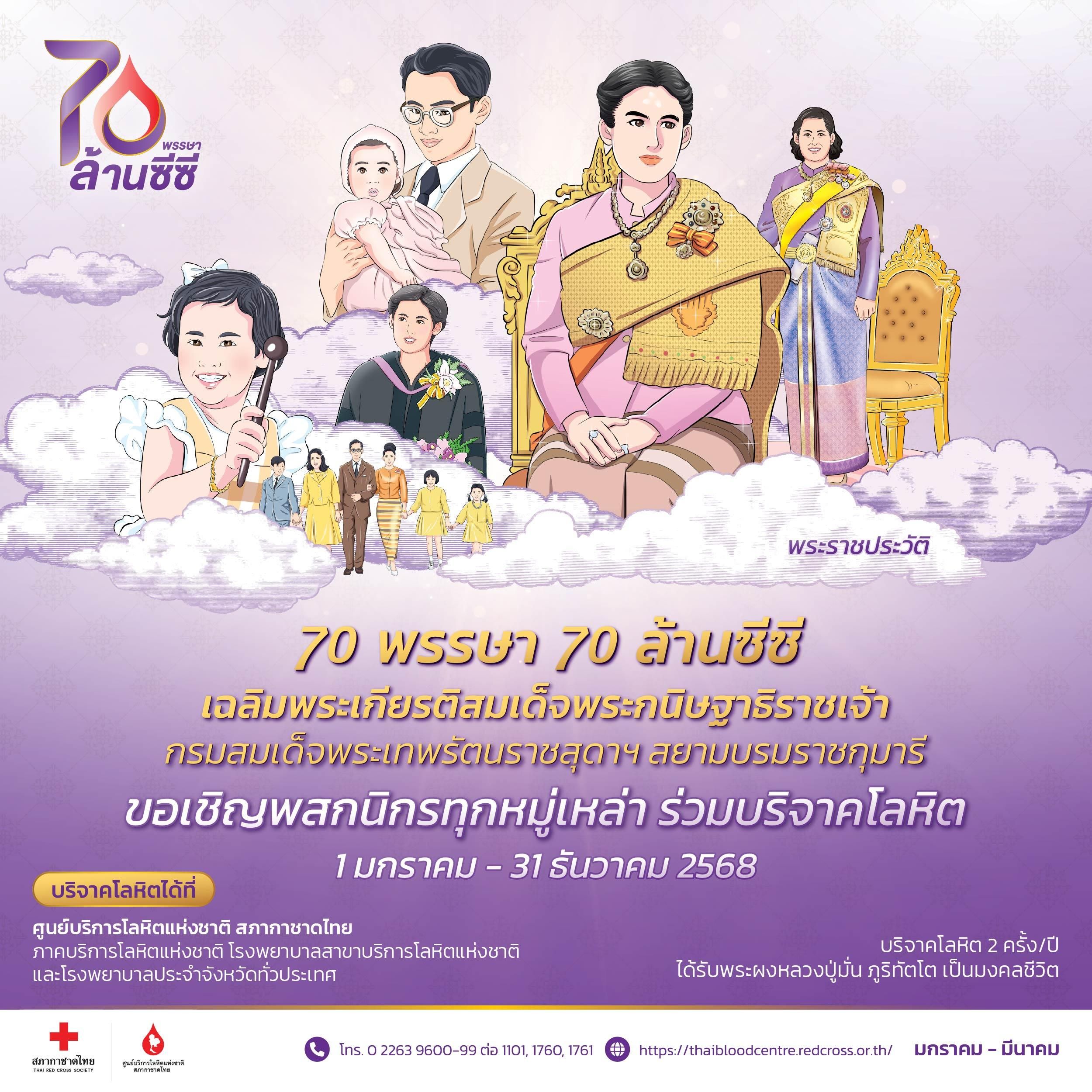 เนื่องในปีแห่งมหามงคล ศูนย์บริการโลหิตแห่งชาติ สภากาชาดไทย ร่วมกับ กองทัพบก และวัดปทุมวนารามราชวรวิหาร น้อมสำนึกในพระมหากรุณาธิคุณ จัดทำโครงการ “70 พรรษา 70 ล้านซีซี เฉลิมพระเกียรติสมเด็จพระกนิษฐาธิราชเจ้า กรมสมเด็จพระเทพรัตนราชสุดา ฯ สยามบรมราชกุมารี” ผู้ทรงเป็นอุปนายิกา ผู้อำนวยการสภากาชาดไทย ทูลกระหม่อมอาจารย์ของโรงเรียนนายร้อยพระจุลจอมเกล้า และองค์พระราชูปถัมภ์ ของโรงเรียนวัดปทุมวนาราม เชิญชวนพสกนิกรทุกหมู่เหล่าทั่วประเทศ ร่วมแสดงความจงรักภักดี บริจาคโลหิตถวายเป็นพระราชกุศลในโครงการฯ ตลอดปี 2568 ผู้บริจาคโลหิต ครบ 2 ครั้ง ในปี 2568 ณ ศูนย์บริการโลหิตแห่งชาติ หน่วยรับบริจาคโลหิตประจำที่ (Fixed Station) หน่วยรับบริจาคโลหิตเคลื่อนที่ ภาคบริการโลหิตแห่งชาติ 12 แห่งทั่วประเทศ โรงพยาบาลสาขาบริการโลหิตแห่งชาติทั่วประเทศ โรงพยาบาลของกองทัพบกทั่วประเทศจะได้รับ “พระผงหลวงปู่มั่น ภูริทตฺโต” เป็นที่ระลึก