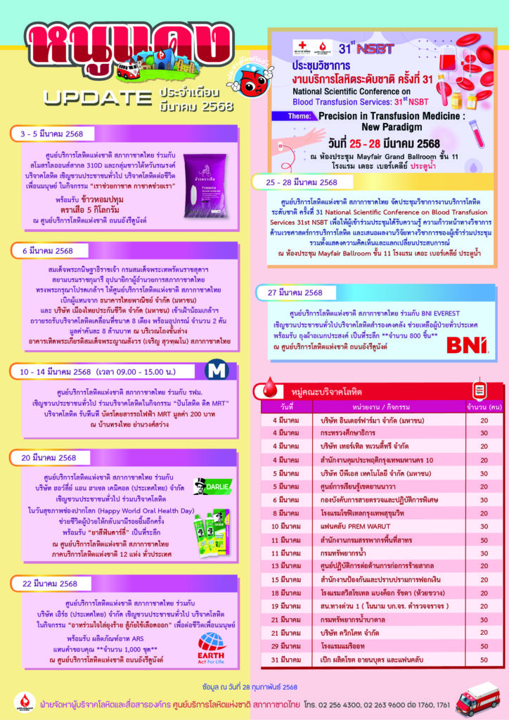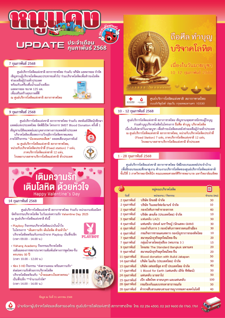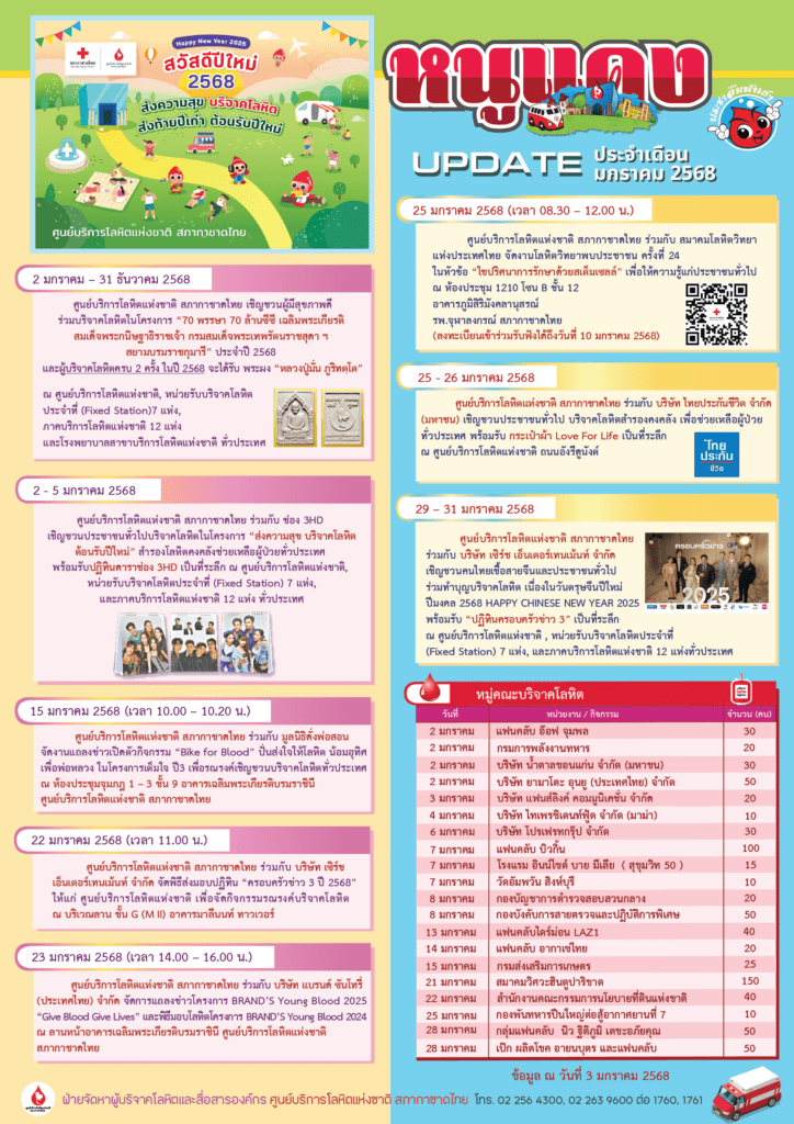 ศูนย์บริการโลหิตแห่งชาติ สภากาชาดไทย ชวนคนไทย ร่วมทำบุญบริจาคโลหิตต้อนรับปีใหม่ไทย ในโครงการ “แล้งนี้ ไม่แล้งน้ำใจ ด้วยการให้โลหิต” ระหว่างวันที่ 8 – 16 เมษายน 2568 เตรียมความพร้อมสำรองโลหิตรับมือหยุดยาวช่วงเทศกาลสงกรานต์ บริจาคโลหิต ณ ศูนย์บริการโลหิตแห่งชาติ หน่วยรับบริจาคโลหิตประจำที่ (Fixed Station) ภาคบริการโลหิตแห่งชาติ 12 แห่งทั่วประเทศ โรงพยาบาลสาขาบริการโลหิต 8 แห่งในกรุงเทพมหานคร รับเสื้อยืด “Give Blood Save Life” เป็นที่ระลึกแทนคำขอบคุณ