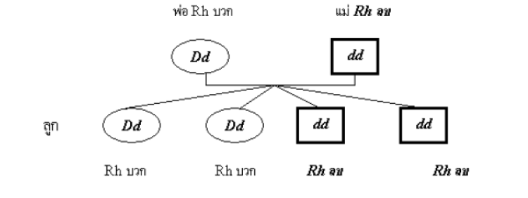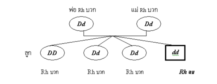 กรณีที่ 1 พ่อและแม่มีหมู่โลหิต Rh+ ทั้งคู่ แต่มียีนด้อยแฝงอยู่ (Dd) มีโอกาสที่ลูกจะมีโลหิตเป็น Rh- 25%