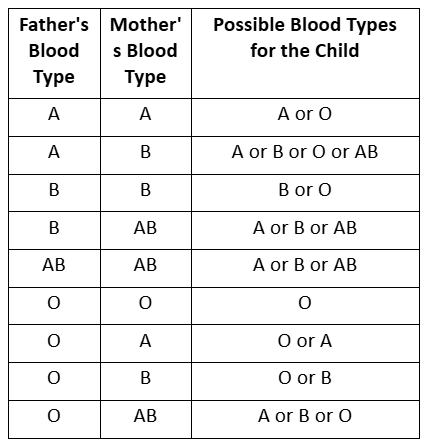 Possible ABO Blood Type Inheritance Patterns of Parents and Child